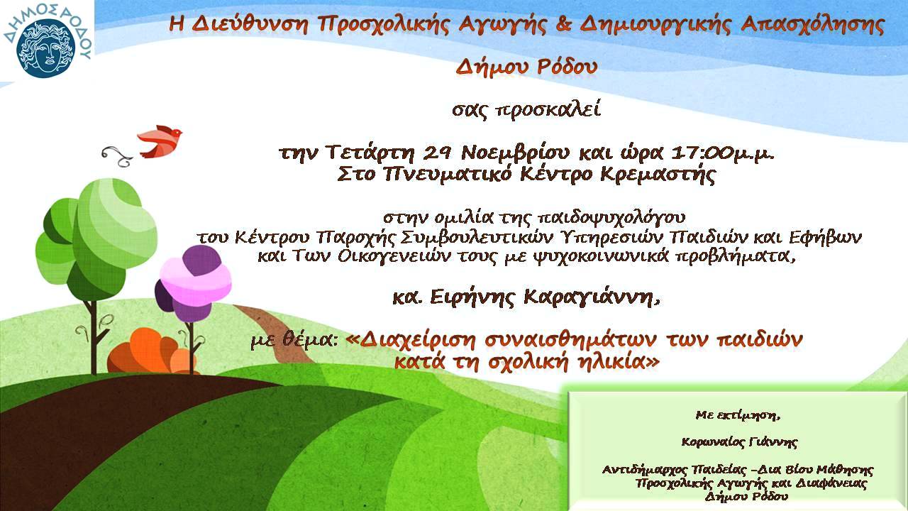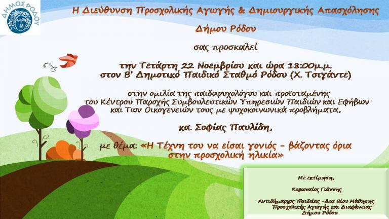 Δελτίο Τύπου-Θέμα: Ομιλίες με τις παιδοψυχολόγους του Δήμου Ρόδου, σε Κρεμαστή αι Ρόδο Ο Δήμος Ρόδου, η Διεύθυνση Προσχολικής Αγωγής και Δημιουργικής Απασχόλησης σε συνεργασία με το Κέντρο Παροχής Συμβουλευτικών Υπηρεσιών Παιδιών και Εφήβων και των οικογενειών τους με ψυχοκοινωνικά προβλήματα, θα πραγματοποιήσουν ομιλίες με την παιδοψυχολόγο και προϊσταμένη κα Σοφία Παυλίδη με θέμα: «Η Τέχνη του να είσαι γονιός - βάζοντας όρια στην προσχολική ηλικία» την Τετάρτη 22 Νοεμβρίου και ώρα 18:00μ.μ. στον Β’ Δημοτικό Παιδικό Σταθμό Ρόδου (Χ. Τσιγάντε) και την παιδοψυχολόγο κα Ειρήνη Καραγιάννη με θέμα «Διαχείριση συναισθημάτων των παιδιών κατά τη σχολική ηλικία» την Τετάρτη 29 Νοεμβρίου και ώρα 17:00μ.μ. στο Πνευματικό Κέντρο Κρεμαστής.