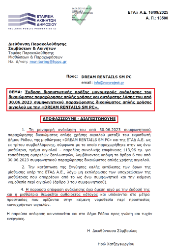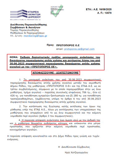 Μετά τις πολύπλευρες παρεμβάσεις του Δικτύου Ομπρέλα που ανέδειξαν την ακραία παραβατικότητα που επικρατεί στην παραλία Έλλη στο κέντρο της πόλης της Ρόδου, η ΕΤΑΔ ΑΕ προχώρησε σε «έκδοση διαπιστωτικής πράξης μονομερούς ανάκλησης του δικαιώματος παραχώρησης και αυτόματης λύσης του συμφωνητικού παραχώρησης δικαιώματος απλής χρήσης αιγιαλού» για δύο μισθώσεις.