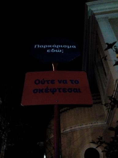 Ούτε να το σκέφτεσαι λέμε... -Πίτσα Χατζή -Ετσι αντιμετωπίζουν καταστηματάρχες κάπου.. στου Ψυρρή στην Αθήνα το παράνομο παρκάρισμα μπροστά απο τα μαγαζιά τους......με πινακίδες τοποθετημένες στα ...υποψήφια προς σύρραξη σημεία ! Εχει χιούμορ και σίγουρα είναι αποτρεπτικό !! Μήπως να το υιοθετήσουμε κι εδώ ? Δεν είναι κακό!