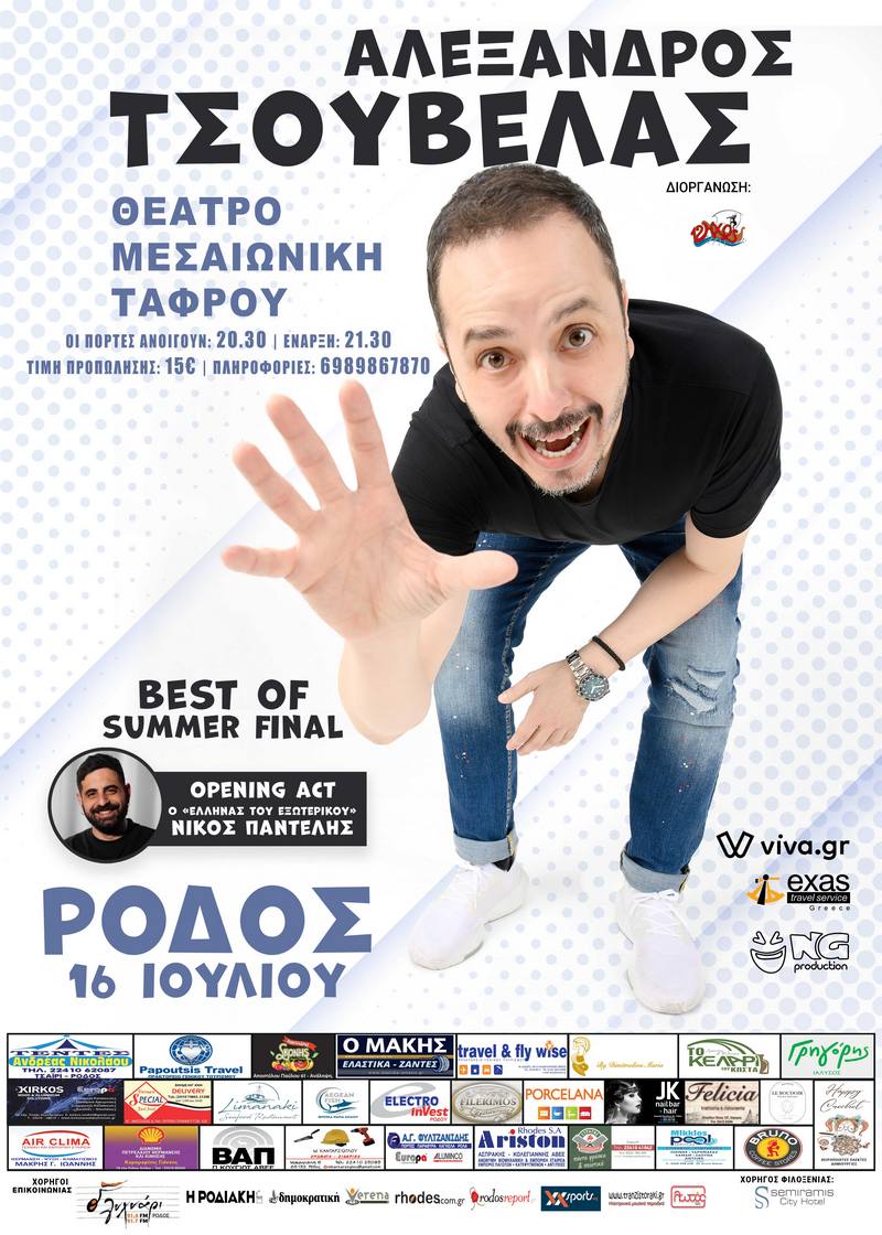 Και ο Αλέξανδρος Τσουβέλας επιστρέφει στο νησί της Ρόδου την Κυριακή 16 Ιουλίου για το “BEST OF” SummerFinalTour, στο Θέατρο της Μεσαιωνικής Τάφρου , με τα καλύτερά κείμενα της πολυετούς πορείας του εμπλουτισμένα με προσωπικά του βιώματα και ιστορίες απείρου κάλλους!