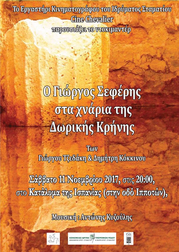 Το Κοινωφελές Ίδρυμα Εμ. & Μ. Σταματίου και η κινηματογραφική του ομάδα «Ciné Chevalier» με χαρά σας προσκαλούν το Σάββατο 11 Νοεμβρίου 2017, στις 20:00, στο Κατάλυμα της Ισπανίας (που βρίσκεται στην οδό Ιπποτών), στην προβολή της ταινίας του Γιώργου Τζεδάκη (George Tzedakis) και του Δημήτρη Κόκκινου, με τίτλο: «Ο Γιώργος Σεφέρης στα χνάρια της Δωρικής Κρήνης». Συντονίστρια της εκδήλωσης θα είναι η κ. Θεώνη Χαντζιάρα. Την ταινία θα προλογίσουν οι δημιουργοί της, ενώ για το μνημείο της Δωρικής Κρήνης θα μιλήσει εκπρόσωπος της Εφορείας Αρχαιοτήτων Δωδεκανήσου. Η παρουσία σας θα μας τιμήσει ιδιαίτερα.