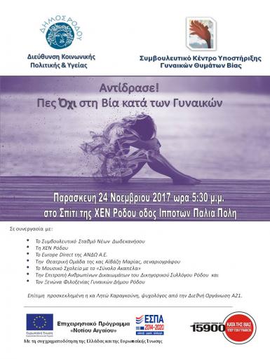 Συνεργατικά σχεδίασαν και θα υλοποιήσουν μια ξεχωριστή εκδήλωση με τίτλο: «Αντίδρασε! Πες ΟΧΙ στη Βία κατά των Γυναικών» για να ευαισθητοποιήσουν τη ροδιακή κοινωνία στην εξάλειψη του φαινομένου κατά της κακοποίησης των γυναικών, αλλά και για να αναδείξουν τη σπουδαιότητα της «Αντίδρασης» σε αυτό, από την ίδια τη γυναίκα και από το ευρύτερο κοινωνικό σύνολο.