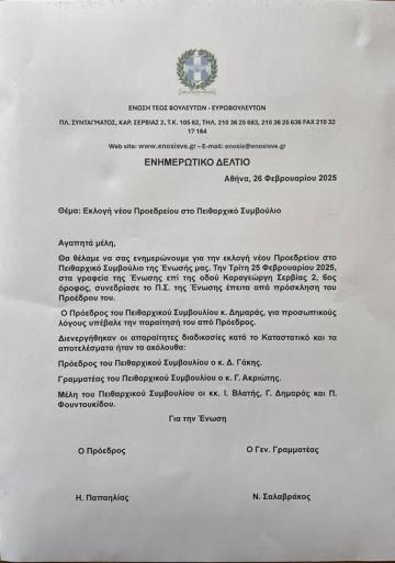 Εκλογή Προέδρου του Πειθαρχικού Συμβουλίου της Ενωσης τέως Βουλευτών και Ευρωβουλευτών.
