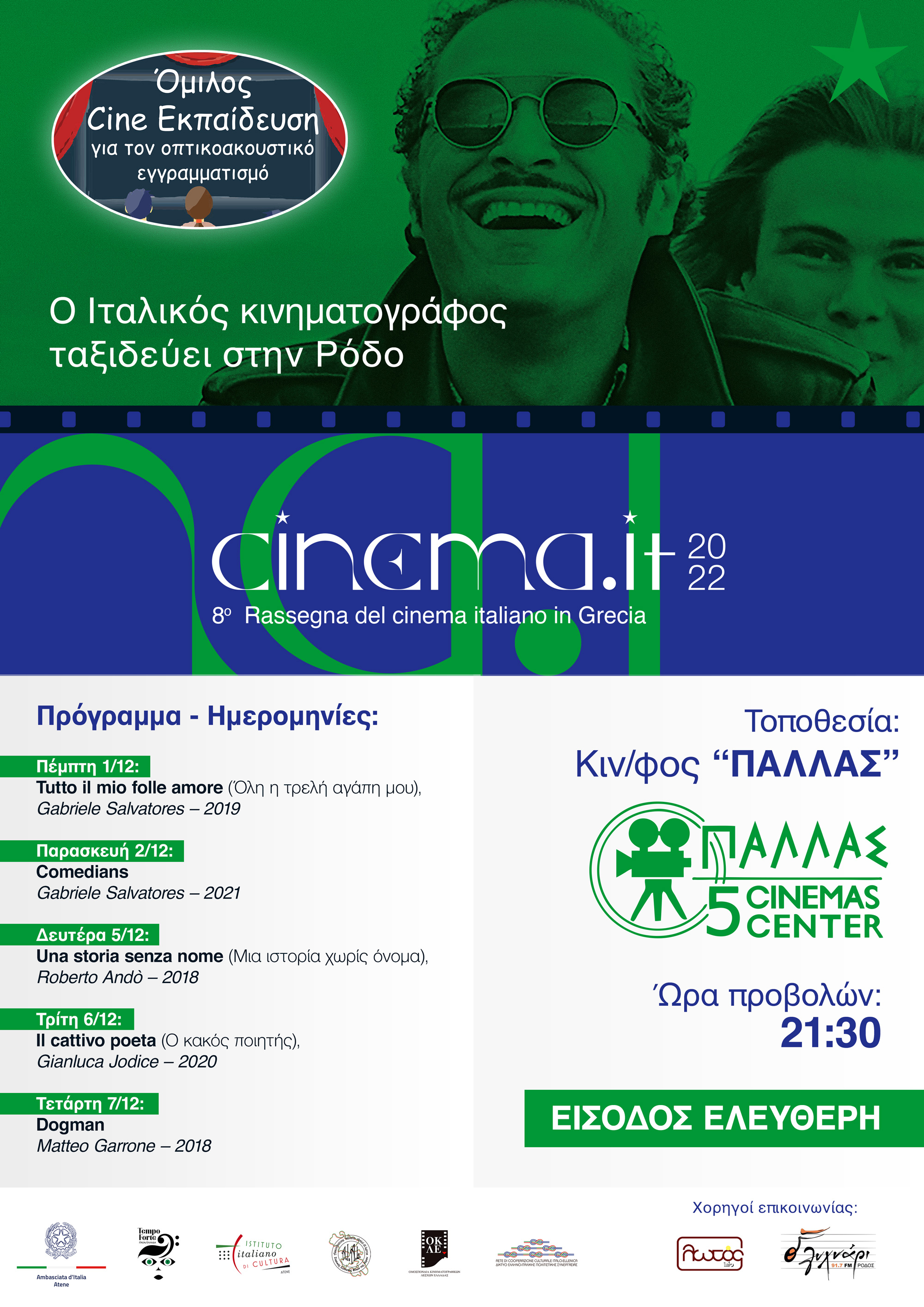 Σας παρακαλούμε να προωθήσετε σε όλα τα Μ.Μ.Ε. (έντυπα και ηλεκτρονικά) της Ρόδου, το Δελτίου Τύπου και την Αφίσα για το Φεστιβάλ Προβολών Ιταλικών Ταινιών που θα πραγματοποιηθεί στη Ρόδο στον Κινηματογράφο ΠΑΛΛΑΣ στις 1, 2, 5, 6, 7 Δεκεμβρίου 2022 στις 21:30μ.μ. Ευχαριστούμε. Εκ μέρους του Δ.Σ. του Ομίλου Cine-Εκπαίδευση. Πέτρος Σπανός, Αναστασία Ζέππου.