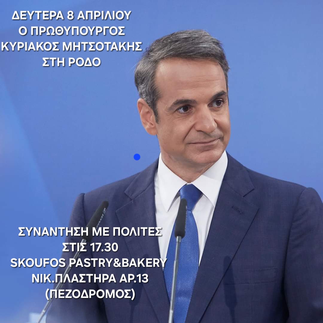 Οπως ανακοινώθηκε επίσημα Ο Πρωθυπουργός & Πρόεδρος της Νέας Δημοκρατίας Κυριάκος Μητσοτάκης θα συναντήσει τους πολίτες στη Ρόδο, τη Δευτέρα 8/4/2024 και ώρα 17:30 μ.μ. στο “Skoufos Pastry & Bakery” (Νικολάου Πλαστήρα 13, επί του πεζόδρομου).