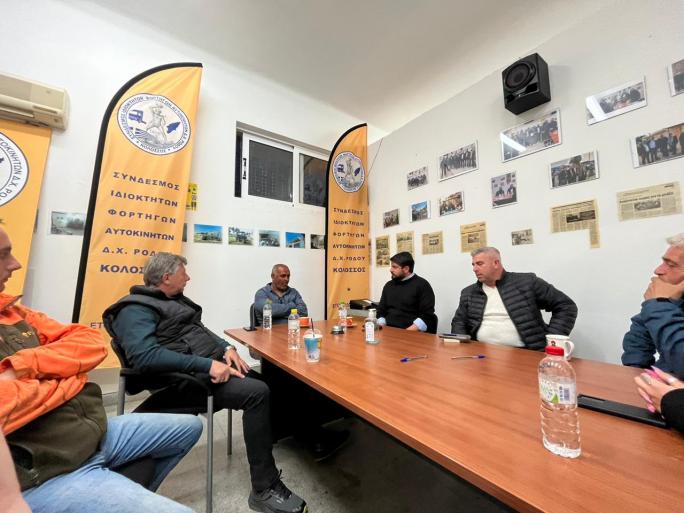 Κατά τη διάρκεια των επαφών που είχε με τον πρόεδρο του Συνδέσμου Ιδιοκτητών Φορτηγών Αυτοκινήτων Δ.Χ. Ρόδου «Κολοσσός», Κων/νο Στυλιανού και μέλη του σωματείου αλλά και με τον πρόεδρο Ιδιοκτητών Φορτηγών Δ.Χ. Ρόδου, Γιάννη Κουνάκη, αναλύθηκαν διεξοδικά τα σημαντικά ζητήματα που αντιμετωπίζει ο κλάδος, με ιδιαίτερη βαρύτητα να δίνεται στην βελτίωση των συνθηκών εργασίας και την εφαρμογή συγκεκριμένων παρεμβάσεων για την κάλυψη των αναγκών τους. Το βασικότερο πρόβλημα, όπως επισημάνθηκε, είναι η έλλειψη τροχονομικού ελέγχου εξαιτίας της υποστελέχωσης των υπηρεσιών αστυνόμευσης, με αποτέλεσμα να διογκώνεται το φαινόμενο της παράνομης δραστηριότητας εις βάρος των επαγγελματιών του κλάδου.