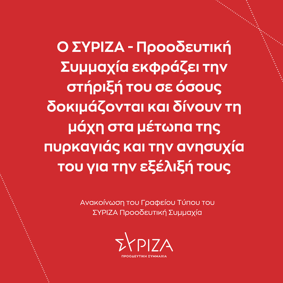 Ο ΣΥΡΙΖΑ - Προοδευτική Συμμαχία έχει εκφράσει την στήριξή του σε όσους δοκιμάζονται και δίνουν τη μάχη στα μέτωπα της πυρκαγιάς και την ανησυχία του για την εξέλιξή τους.