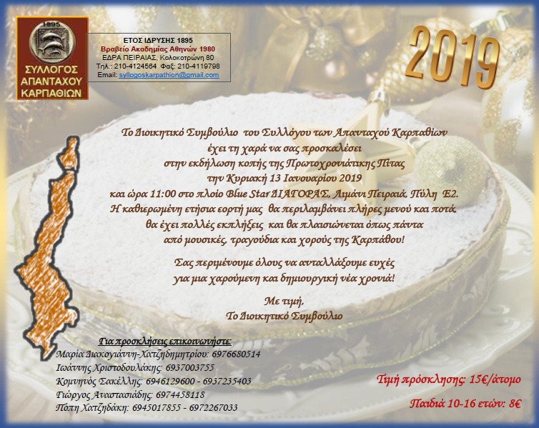 Σας περιμένουμε όλους να γιορτάσουμε τον ερχομό του νέου έτους και να ανταλλάξουμε ευχές στην εκδήλωση κοπής της Βασιλόπιτας του Συλλόγου μας την Κυριακή 13 Ιανουαρίου 2019 και ώρα 11.00 στο πλοίο Blue Star Διαγόρας, στο λιμάνι του Πειραιά, πύλη Ε2.