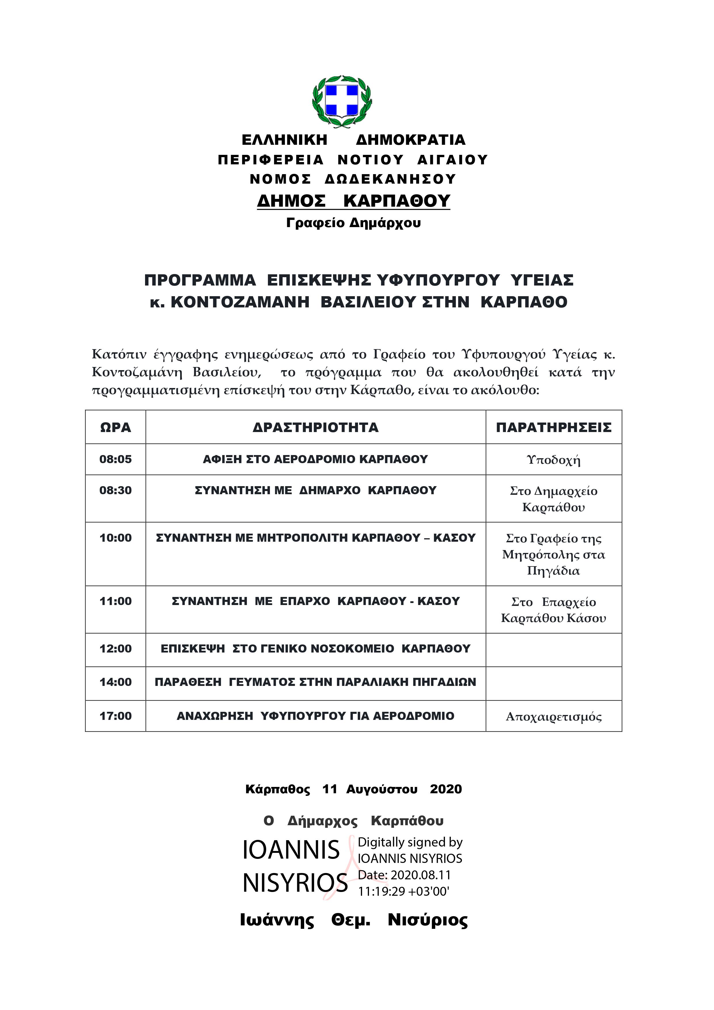 Την Τετάρτη 12 Αυγούστου θα επισκεφθεί την Κάρπαθο ο υφυπουργός Υγείας Βασίλης Κοντοζαμάνης. Η επίσκεψη του σχετίζεται με την έναρξη λειτουργίας του νέου νοσοκομείου του νησιού. Ο υφυπουργός κατά την παραμονή του στο νησί θα συναντηθεί με την Έπαρχο Καλλιόπη Νικολαίδου, τον δήμαρχο Γιάννη Νισύριο, τον Μητροπολίτη και θα επισκεφθεί το νέο νοσοκομείο Καρπάθου.
