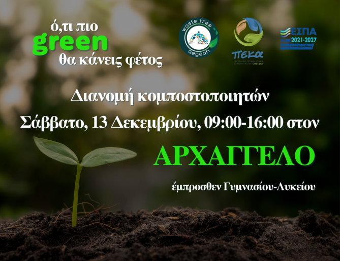 Το Σάββατο 13 Δεκεμβρίου 2025, από τις 09:00 έως τις 16:00, θα πραγματοποιηθεί διανομή κομποστοποιητών στον Αρχάγγελο Ρόδου, μπροστά από το Γυμνάσιο–Λύκειο. Τα επόμενα Σάββατα θα ακολουθήσουν και άλλοι οικισμοί της Ρόδου, με το πρόγραμμα να δημοσιοποιείται κάθε εβδομάδα.