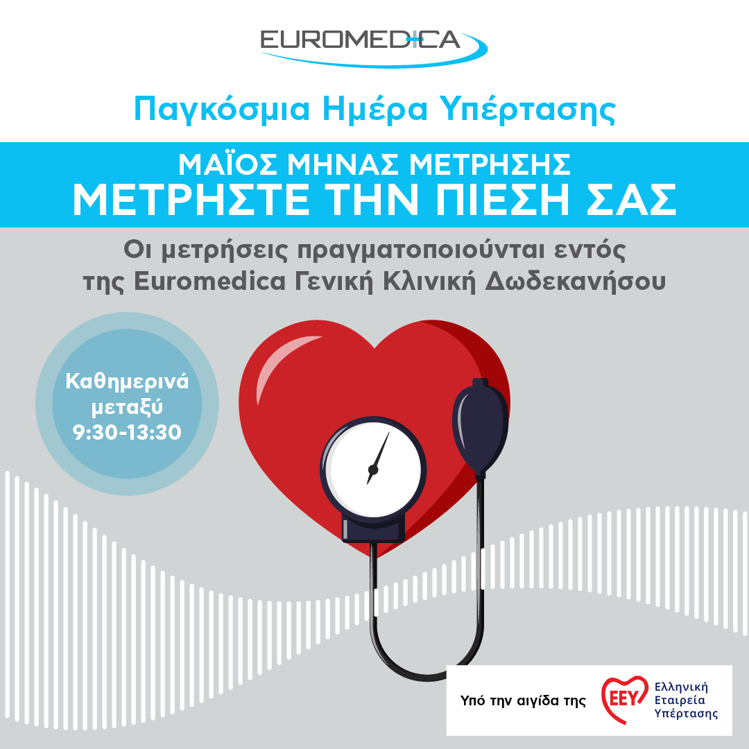 Οι μετρήσεις πίεσης θα πραγματοποιούνται καθημερινά έως την Παρασκευή 31 Μαΐου, στην Euromedica Γενική Κλινική Δωδεκανήσου, σε ειδικό χώροαπό τις 9.30πμ έως και τις 1.30μμ, χωρίς ραντεβού, υπό την επίβλεψη του Δ/ντη της Παθολογικής Κλινικής, Παθολόγου, ΚλινικούΥπερτασιολόγου,κ. Νικήτα Παπανικήτα. Σημειώνεται ότι η μέτρηση γίνεται χωρίς χρέωση.