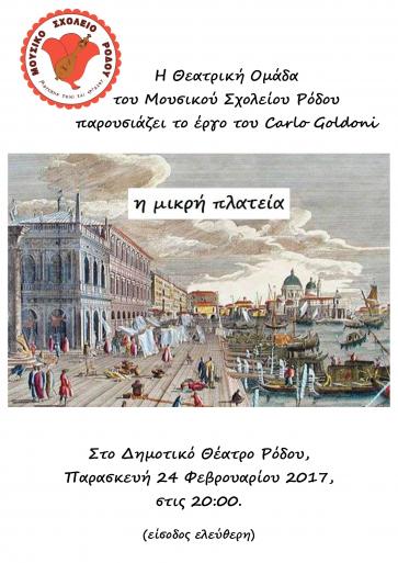 ΜΟΥΣΙΚΟ ΣΧΟΛΕΙΟ ΡΟΔΟΥ -Τρίτη 21/02/2017 -Η Θεατρική Ομάδα τού Μουσικού Σχολείου Ρόδου σας προσκαλεί στο Δημοτικό Θέατρο Ρόδου, την Παρασκευή 24 Φεβρουαρίου 2017, στις 8:00 το βράδυ, όπου παρουσιάζει το έργο τού Κάρλο Γκολντόνι «η μικρή πλατεία». Πρόκειται για μια κωμωδία, που ανέβηκε για πρώτη φορά στη Βενετία, στις 19 Φεβρουαρίου 1756, την περίοδο του καρναβαλιού, για το οποίο και ετοιμάστηκε. Η είσοδος είναι ελεύθερη.