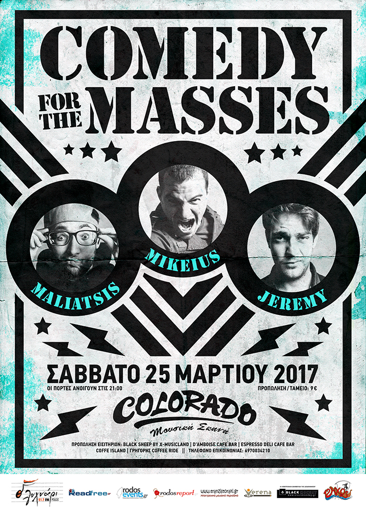 Παράσταση Stand up Comedy "Comedy for the masses" με τους Mikeius, Jeremy και Κώστα Μαλάτση, το Σάββατο 25 Μαρτίου στο Colorado!!