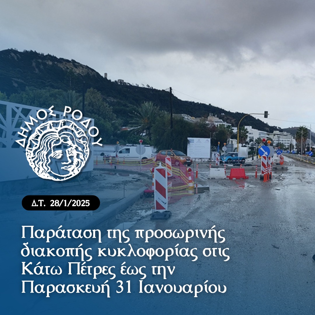 Ο Δήμος Ρόδου ενημερώνει τους πολίτες ότι η προσωρινή διακοπή κυκλοφορίας στην Επαρχιακή Οδό Ρόδου-Καμείρου, από το 1ο χιλιόμετρο (συμβολή με οδό Παπαλουκά) έως το 2ο χιλιόμετρο (περιοχή Κάτω Πέτρες) και στα δύο ρεύματα κυκλοφορίας, παρατείνεται έως τις 09:00 το πρωί της Παρασκευής, 31 Ιανουαρίου 2025