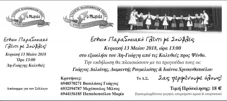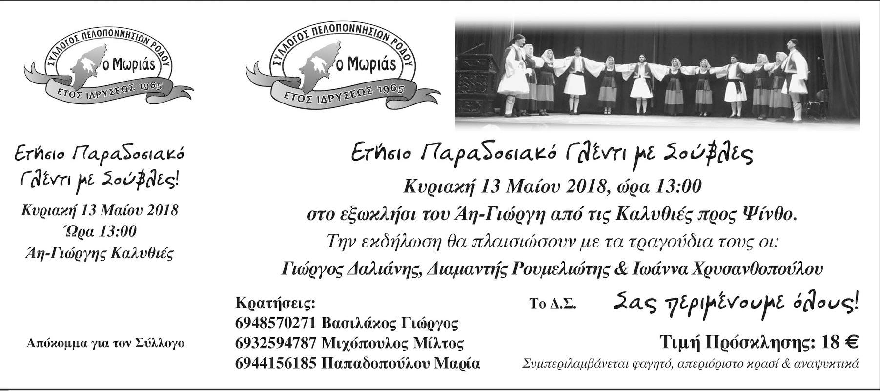 Αγαπητά Μέλη - Φίλες και Φίλοι του Συλλόγου μας -Σας το υποσχεθήκαμε και το κάνουμε πράξη! Σας υποσχεθήκαμε ένα Παραδοσιακό Γλέντι με Σούβλες , ξέρετε εσείς, αρνί, κατσίκι , κοκορέτσι, κοντοσούβλι, γουρνοπούλα μπόλικο κρασί και φυσικά.....διασκέδαση χωρίς μουσική, είναι σαν το φαγητό χωρίς το αλάτι...Γιώργος Δαλιάνης στο Κλαρίνο με συντροφιά την Ιωάννα Χρυσανθοπούλου και τον Διαμαντή Ρουμελιώτη στο τραγούδι. Τα υπόλοιπα θα τα φροντίσει ο Κυριάκος Κωνσταντάκης με την ορχήστρα του. Ελάτε να χορέψουμε, να τραγουδήσουμε και να γλεντήσουμε την Κυριακή 13 Μαΐου το μεσημέρι , στο Μοναστήρι του Αη- Γιώργη ( Καλυθιές προς Ψίνθο ). Σας το έχουμε υποσχεθεί και οι υποσχέσεις στον Σύλλογο μας τηρούνται κατά γράμμα.....για να σας έχουμε πάντα δίπλα μας. Η προπώληση και οι κρατήσεις ξεκίνησαν...Σας περιμένουμε. !!!!!! .