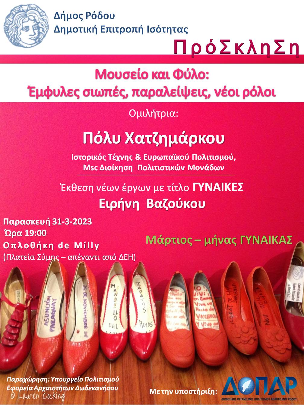 - Διπλή είναι η εκδήλωση με γενικό τίτλο «Μουσεία και Φύλο», η οποία οργανώνεται από τη Δημοτική Επιτροπή Ισότητας Ρόδου, στο πλαίσιο του προγραμματισμού «Μάρτιος-Μήνας Γυναίκας».