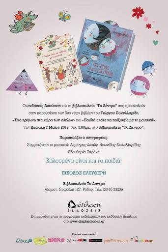 ΔΕΛΤΙΟ ΤΥΠΟΥ-Οι εκδόσεις Διάπλαση και το βιβλιοπωλείο «Το Δέντρο» σας προσκαλούν στην παρουσίαση των δύο νέων βιβλίων του Ρόδιου εκπαιδευτικού(επί σειρά ετών διδάσκοντα στα παιδαγωγικά τμήματα του Πανεπιστημίου Αιγαίου), διευθυντή Χορωδιών και συγγραφέα παιδικών και μουσικοπαιδαγωγικών βιβλίων, Γιώργου Σακελλαρίδη.