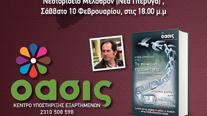 Το Σάββατο στις 10 Φεβρουαρίου στις 18.00 μμ θα πραγματοποιήσει την παρουσίαση του βιβλίου του «Η αποπλάνηση του εθισμού» στο Νεστορίδειο Μέλαθρο (νέα πτέρυγα)