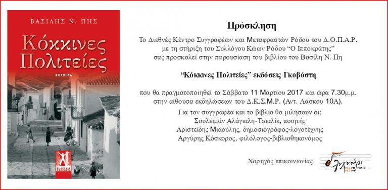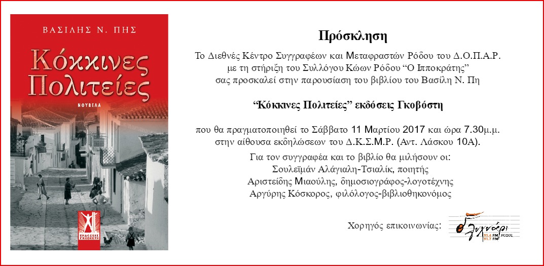 Το Διεθνές Κέντρο Συγγραφέων και Μεταφραστών Ρόδου του ΔΟΠΑΡ σας προσκαλεί στην παρουσίαση του βιβλίου "Κόκκινες Πολιτείες" του Κώου συγγραφέα Βασίλη Ν. Πη που θα πραγματοποιηθεί το Σάββατο 11 Μαρτίου 2017 και ώρα 19.30 στις εγκαταστάσεις του ΔΚΣΜΡ. Σας περιμένουμε.