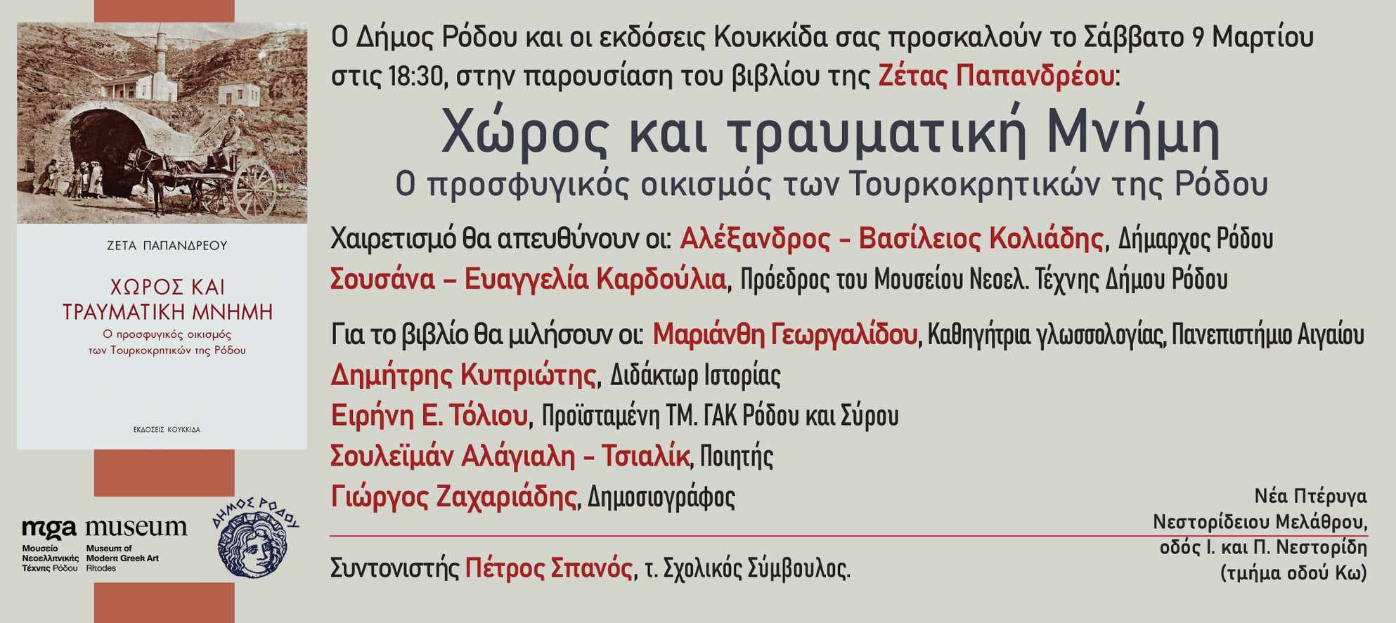 Ο Δήμος Ρόδου, το Μουσείο Νεοελληνικής Τέχνης Δήμου Ρόδου και οι Εκδόσεις Κουκκίδα σας προσκαλούν στην εκδήλωση για την παρουσίαση του βιβλίου της Ζέτας Παπανδρέου «Χώρος και τραυματική μνήμη. Ο προσφυγικός οικισμός των Τουρκοκρητικών της Ρόδου», το Σάββατο 9 Μαρτίου στις 18.30, στη Νέα Πτέρυγα του Νεστορίδειου Μελάθρου.