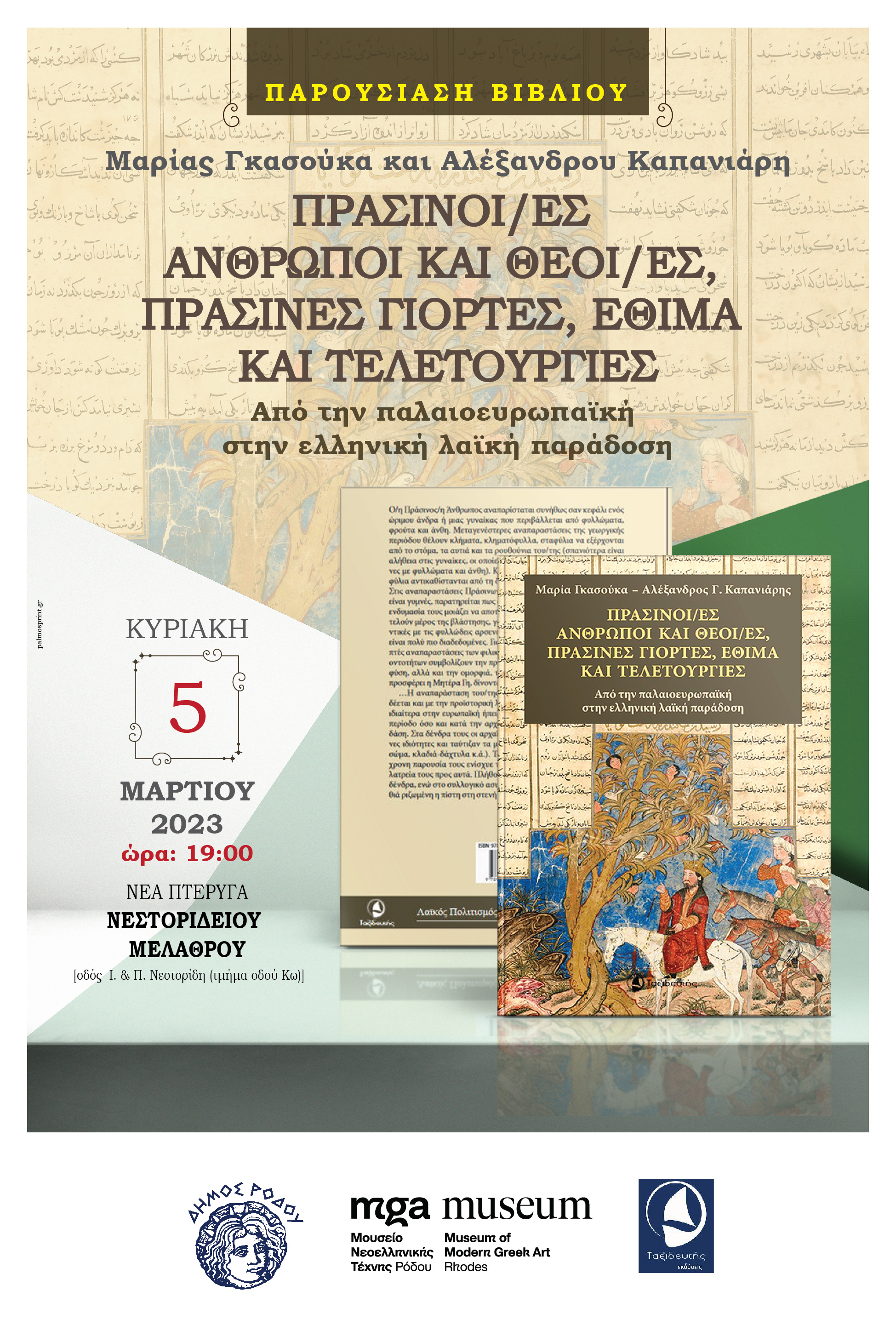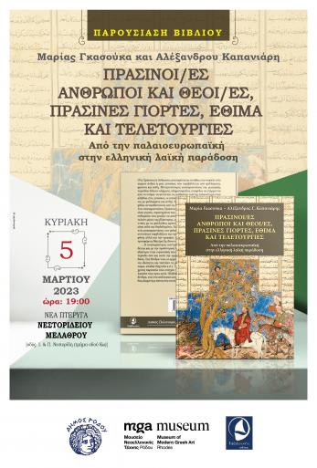 Το Τμήμα Πολιτισμού της Διεύθυνσης Παιδείας, Πολιτισμού και Αθλητισμού του Δήμου Ρόδου και οι εκδόσεις Ταξιδευτής σας προσκαλούν την Κυριακή 5 Μαρτίου 2023 και ώρα 19:00, στη Νέα Πτέρυγα του Νεστορίδειου Μελάθρου οδός Ι. & Π. Νεστορίδη (τμήμα οδού Κω) στην παρουσίαση του βιβλίου της Μαρίας Γκασούκα και του Αλέξανδρου Καπανιάρη με τίτλο “ΠΡΑΣΙΝΟΙ/ΕΣ ΑΝΘΡΩΠΟΙ ΚΑΙ ΘΕΟΙ/ΕΣ, ΠΡΑΣΙΝΕΣ ΓΙΟΡΤΕΣ, ΕΘΙΜΑ ΚΑΙ ΤΕΛΕΤΟΥΡΓΙΕΣ. Από την παλαιοευρωπαϊκή στην ελληνική λαϊκή παράδοση”.