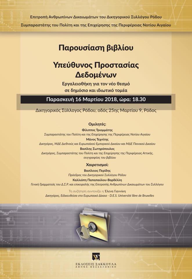 ΔΕΛΤΙΟΥ ΤΥΠΟΥ-Η Επιτροπή Ανθρωπίνων Δικαιωμάτων του Δικηγορικού Συλλόγου Ρόδου σε συνεργασία με τον Συμπαραστάτη του Πολίτη και της Επιχείρηση της Περιφέρειας Νοτίου Αιγαίου με ιδιαίτερη τιμή συνδιοργανώνουν την παρουσίαση του βιβλίου των εκδόσεων Σάκκουλα «ΥΠΕΥΘΥΝΟΣ ΠΡΟΣΤΑΣΙΑΣ ΔΕΔΟΜΕΝΩΝ Εργαλειοθήκη για το νέο θεσμό σε δημόσιο και ιδιωτικό τομέα» του κ. Βασίλη Σωτηρόπουλου, Δικηγόρου και Συμπαραστάτη του Πολίτη και της Επιχείρησης της Περιφέρειας Αττικής.