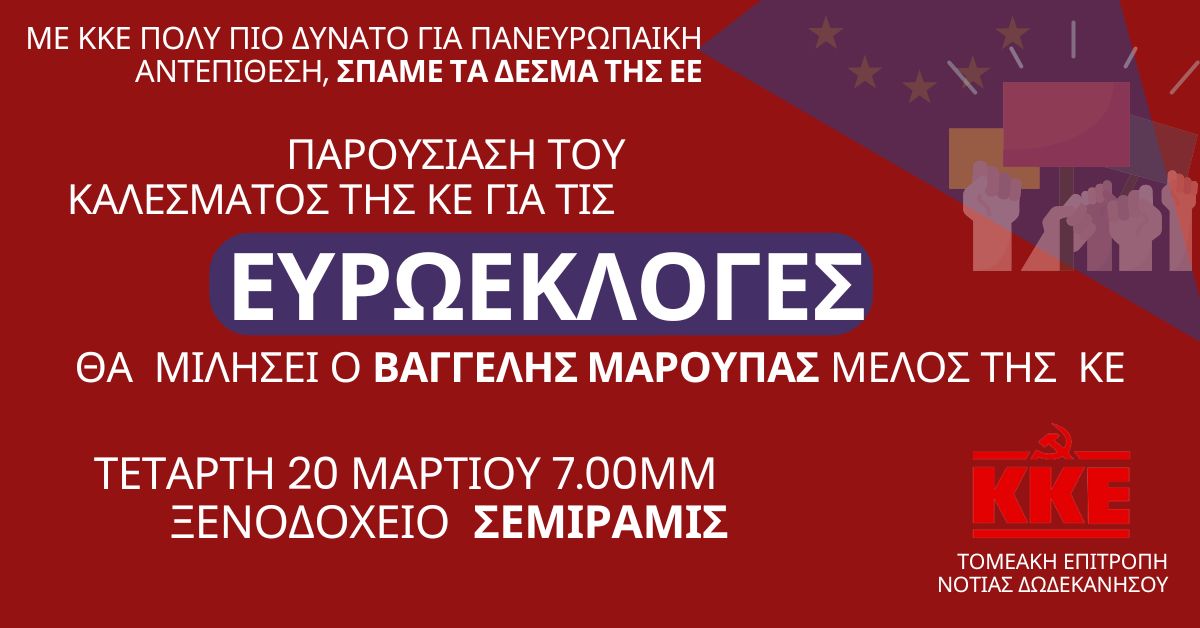 Οι οργανώσεις Νότιας Δωδεκανήσου του ΚΚΕ και της ΚΝΕ οργανώνουν εκδήλωση για την παρουσίαση τους καλέσματος της ΚΕ του ΚΚΕ για τις ευρωεκλογές.