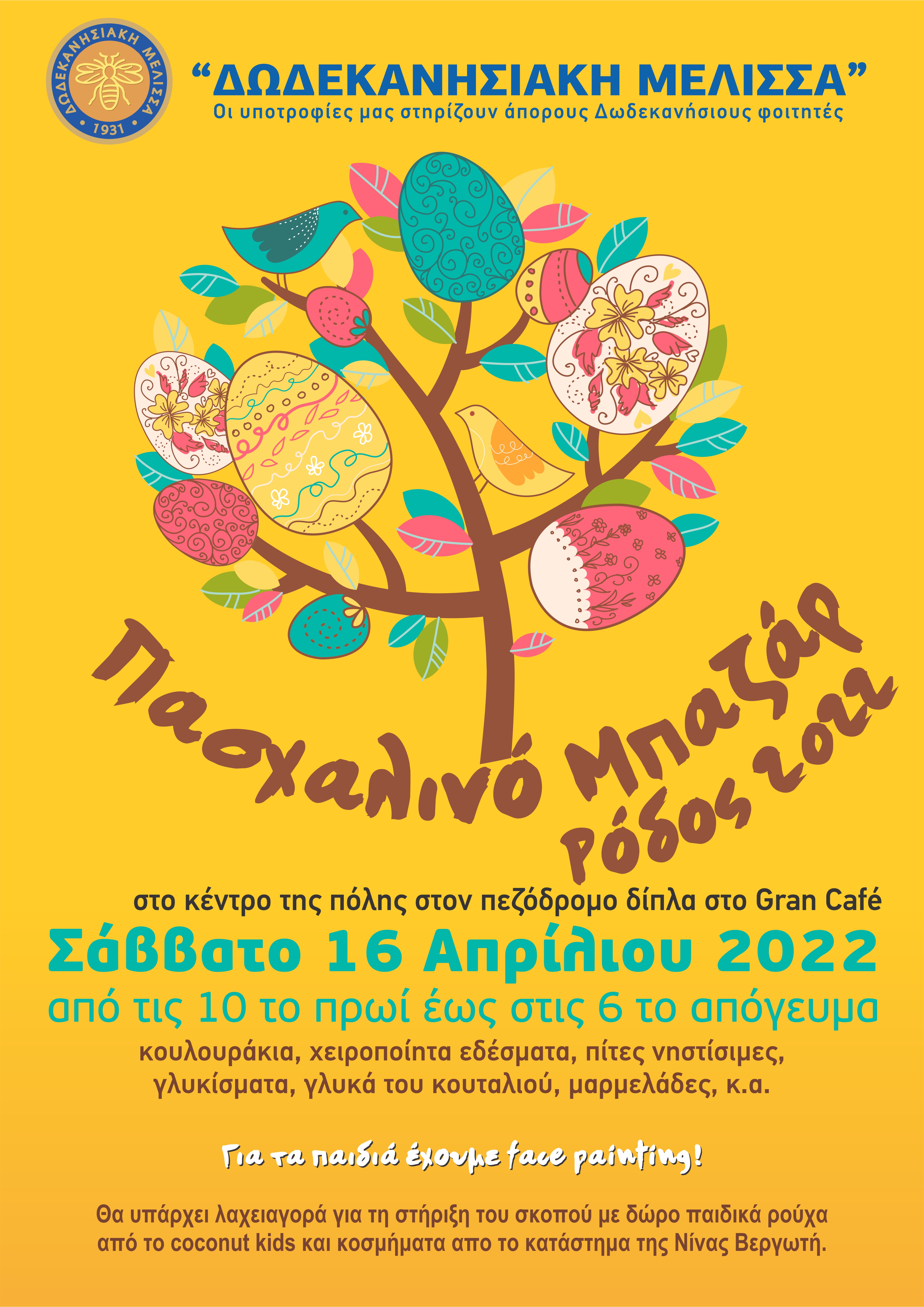 Το Σάββατο 16 Απριλίου 2022, θα πραγματοποιηθεί στη Ρόδο, στο πεζοδρόμιο δίπλα στο GranCafe, από τις 10 το πρωί μέχρι τις 6 το απόγευμα, το Πασχαλιάτικο Μπαζάρ του Συλλόγου υποτροφιών «Δωδεκανησιακή Μέλισσα», Επιτροπή Ρόδου. Είναι η εκδήλωση που περιμένουν οι Ροδίτες για να προμηθευτούν τα πασχαλιατικά τους τόσο για την ποιότητα και ποικιλία που βρίσκουν όσο και γιατί γνωρίζουν ότι στηρίζουν τους σκοπούς της Μέλισσας. Όλη η προσπάθεια, σταθερά και διαχρονικά κατευθύνεται στη βοήθεια των άπορων Δωδεκανήσιων σπουδαστών να σπουδάσουν. Μεγάλο το έργο αλλά και η ανταπόκριση του κόσμου.