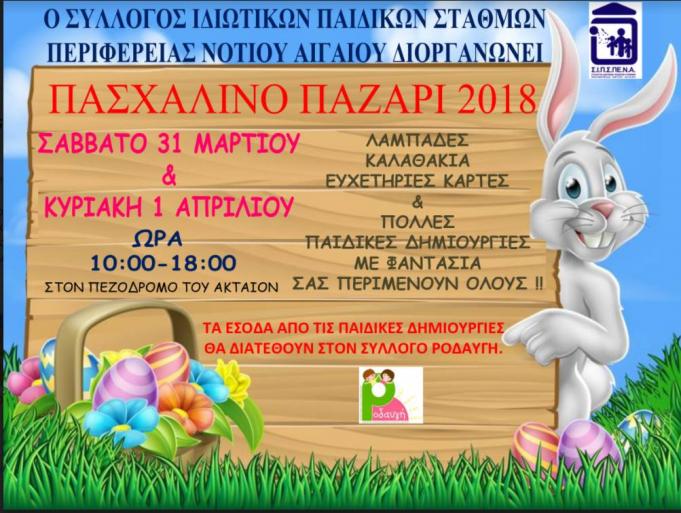 Πασχαλινό Παζάρι 2018! Ο Σύλλογος Ιδιωτικών Παιδικών Σταθμών Ν.Α οργανώνει πασχαλινό παζάρι με λαμπάδες, καλαθάκια, ευχετήριες κάρτες και πολλές παιδικές δημιουργίες. Τα έσοδα απο τις παιδικές δημιουργίες θα διατεθούν για καλό σκοπό, στη Ροδαυγή. Σάββατο 31 Μαρτίου και Κυριακή 1 Απριλίου απο τις 10 το πρωί εως τις 6 το απόγευμα. ΠΕΖΟΔΡΟΜΟΣ ΑΚΤΑΙΟΝ,ΜΑΝΔΡΑΚΙ ΡΟΔΟΥ