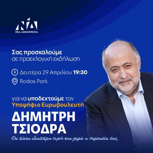 Ο ΔημήτρηςΤσιόδρας, δημοσιογράφος - συγγραφέας και διευθυντής του Γραφείου Τύπου του Πρωθυπουργού Κυριάκου Μητσοτάκη, θα βρεθεί στη Ρόδο τη Δευτέρα 29 Απριλίου όπου στις 19:30 θα μιλήσει στο ξενοδοχείο Rodos Park, Ρήγα Φερραίου 12. Την Τρίτη 30 Απριλίου ο υποψήφιος Ευρωβουλευτής της Νέας Δημοκρατίας θα βρίσκεται στην Κω προκειμένου να μιλήσει στις 13:00 στο Η2Ο All Day Bar - Restaurant, Λ. Βασιλέως Γεωργίου Β´ 7.