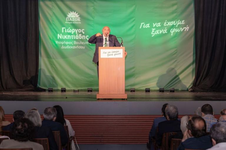 Ο Γιώργος Νικητιάδης, εισήλθε κατά χειροκροτούμενος στην αίθουσα του Δημοτικού Θεάτρου. Τον τέως υφυπουργό Πολιτισμού Τουρισμού προλόγισε ο γραμματέας Νησιωτικής Πολιτικής του ΠΑΣΟΚ Νικηφόρος Παπανικόλας, ο οποίος μεταξύ άλλων, αφού έκανε αναφορά στην πληθωρική προσωπικότητα του υποψήφιου βουλευτή, έθεσε μεταξύ άλλων το ερώτημα «πώς είναι δυνατόν ο Γ. Νικητιάδης να συναντάει την μια ημέρα τον Πρόεδρο της Επιτροπής Εξωτερικών Σχέσεων της Γερουσίας των ΗΠΑ Ρόμπερτ Μενέντεζ και να συζητάνε τα σημαντικά ζητήματα εξωτερικής πολιτικής που απασχολούν τη χώρα μας και μέσα σε λίγες ώρες να βρίσκεται από την Ουάσιγκτον στα Δωδεκάνησα και να συζητά με τους ξενοδοχοϋπαλλήλους στη Ρόδο και στην Κω, για τα προβλήματα που τους απασχολούν όπως η επέκταση του επιδόματος ανεργίας και το εφάπαξ ή να βρίσκεται στο πιο απομακρυσμένο σημείο της χώρας και να αφουγκράζεται τα προβλήματα του κάθε πολίτη, από την εγκαταλελειμμένη υγεία έως την πλήρη έλλειψη στρατηγικού σχεδιασμού σε όλους σχεδόν τους τομείς».