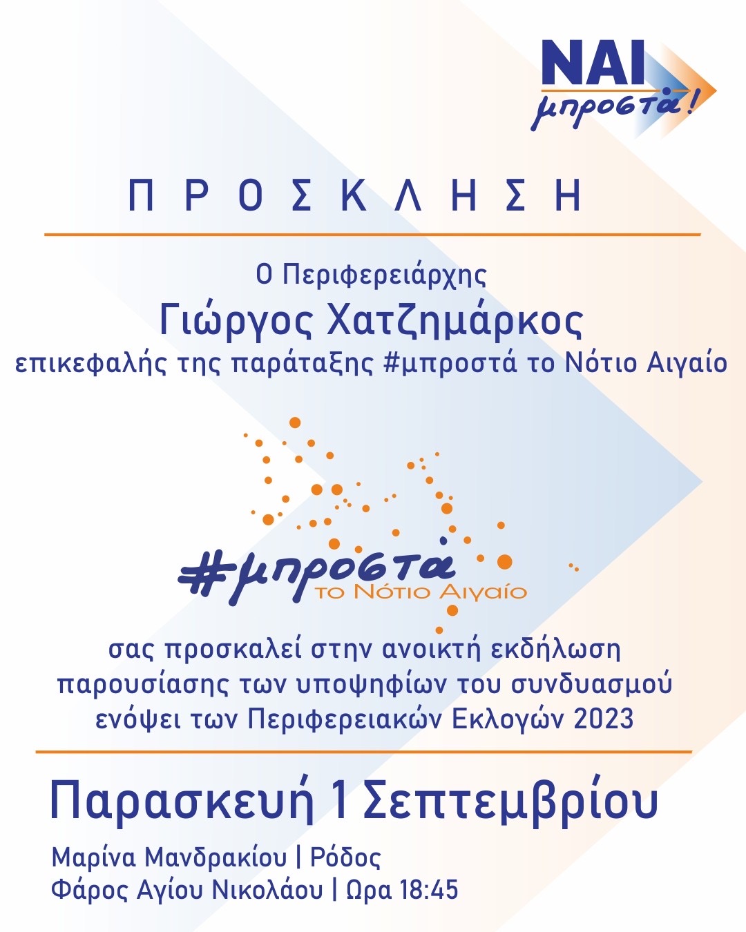Αύριο, Παρασκευή 1 Σεπτεμβρίου ο Περιφερειάρχης και επικεφαλής της παράταξης παρουσιάζει τους υποψήφιους σε ανοικτή εκδήλωση στη Μαρίνα Μανδρακίου, ώρα 18:45.
