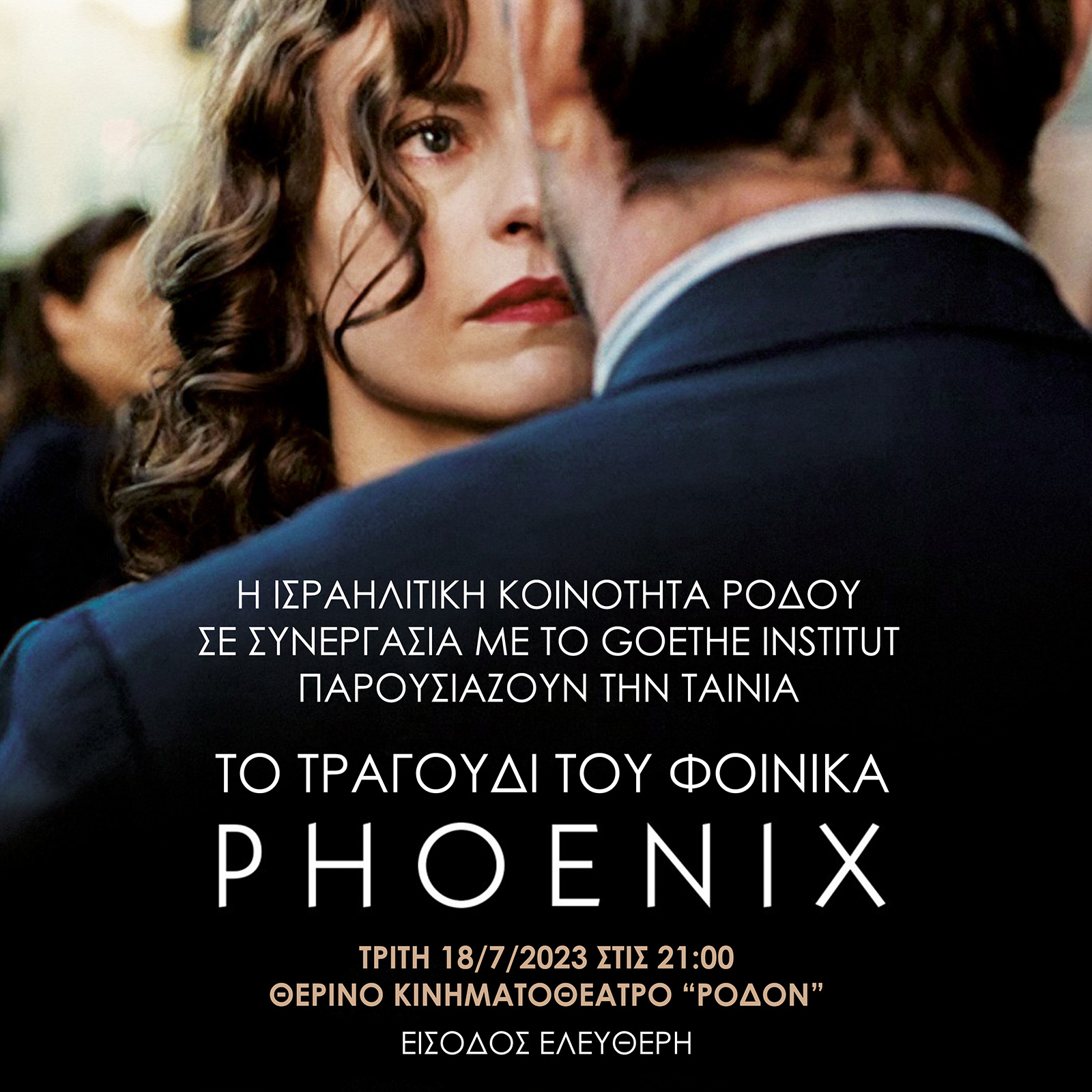 Η Ισραηλιτική Κοινότητα Ρόδου στο πλαίσιο των ετήσιων εκδηλώσεων μνήμης για τον εκτοπισμό των Εβραίων της Ρόδου και της Κω, θα προβάλλει, σε συνεργασία με την Ταινιοθήκη του Goethe-Institut και με την ευγενική δωρεάν παραχώρηση από την εταιρία διανομής Rosebud.21, την ταινία «Το Τραγούδι του Φοίνικα». Η προβολή θα πραγματοποιηθεί στον Θερινό Κινηματοθέατρο «ΡΟΔΟΝ» την Τρίτη 18 Ιουλίου, στις 9:00 μ.μ.