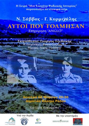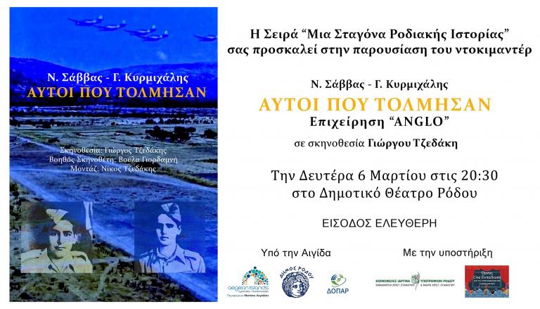 Το ντοκυμαντέρ «Ν. Σάββας – Γ. Κυρμιχάλης – ΑΥΤΟΙ ΠΟΥ ΤΟΛΜΗΣΑΝ- επιχείρηση “ANGLO”», σε σκηνοθεσία Γιώργου Τζεδάκη, θα παρουσιαστεί στο πλαίσιο του εορτασμού για την Ενσωμάτωση της Δωδ/σου, την Δευτέρα 6 Μαρτίου, στις 8.30 μ.μ. στο Δημοτικό Θέατρο Ρόδου.