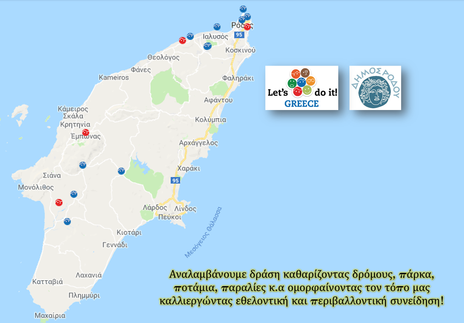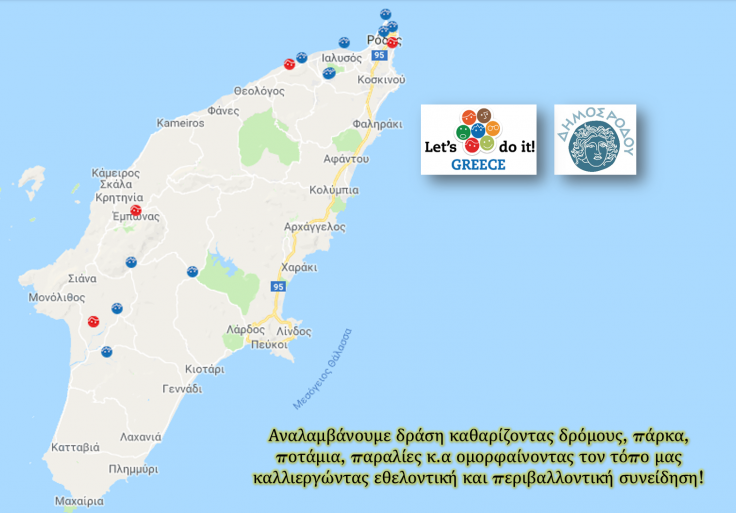 Δελτίο Τύπου-Θέμα: Προγραμματισμένες Δράσεις Lets Do it 2017 για το νησί της Ρόδου Ο Δήμος Ρόδου υποστηρίζοντας κάθε εκδήλωση περιβαλλοντικού χαρακτήρα ή κοινωνικής αλληλεγγύης που βάζει σε κίνηση τους πολίτες απευθύνει ανοιχτό κάλεσμα σε όλους τους πολίτες, φορείς, συλλόγους κ.α να στηρίξουν τις δράσεις που θα πραγματοποιηθούν στο πλαίσιο της εθελοντικής εκστρατείας "Let's do it Greece" με στόχο η Ρόδος για ακόμη μια φορά να προβάλλει το καλό της πρόσωπο, το πρόσωπο των ανθρώπων που προσπαθούν και προσφέρουν καθημερινά, το πρόσωπο των εθελοντών που συνεργάζονται σε κοινή προσπάθεια, το πρόσωπο της χαράς, της συμμετοχής και της δημιουργικότητας. Οι δράσεις που θα πραγματοποιηθούν είναι οι εξής: Τρίτη 24 Απριλίου Καθαρισμός περιοχής από Άγιο Αβακούμ έως Άγιο Φανούριο Καθαρισμός περιοχής από Άγιο Αβακούμ έως Άγιο Φανούριο, από τους μαθητές και τους εκπαιδευτικούς του Δημοτικού Σχολείου Παραδεισίου. Σημείο Συνάντησης: Δημοτικό Σχολείο Παραδεισίου στις 09:00 π.μ