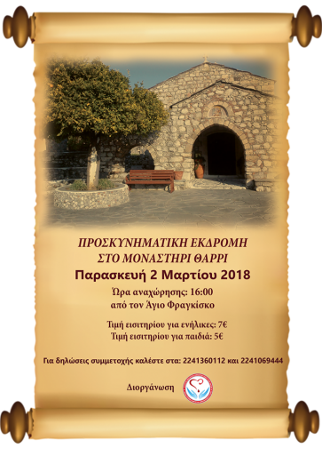 Ο Σύλλογος Εθελοντών Αιμοδοτών Ρόδου Άγιος Εφραίμ, σας προσκαλεί στην προσκυνηματική εκδρομή στο Θάρρι, την Παρασκευή 2 Μαρτίου 2018, για να παρακολουθήσουμε τους Β΄ Χαιρετισμούς.