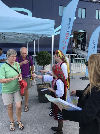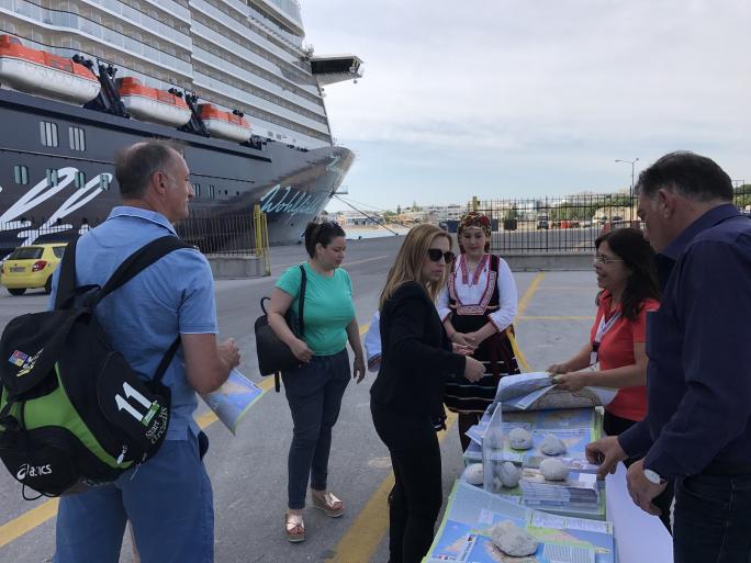 Η Διευθύντρια της Διεύθυνσης Τουρισμού Δήμου Ρόδου κα Βεατρίκη Σέρβου που είχε και την εποπτεία της ολοκληρωμένης πληροφόρησης των επιβατών και γενικότερα της όλης τελετής υποδοχής που υλοποίησε η Διεύθυνση Τουρισμού Δήμου Ρόδου, σε συνεργασία με τον προϊστάμενο του Τμήματος Προβολής, Προώθησης και Πληροφόρησης κο Κώστα Χατζίκο, την προϊσταμένη του Τμήματος Στρατηγικού Σχεδιασμού και Ανάπτυξης Τουρισμού κα Ειρήνη Χατζηνικολάου και το στέλεχος της Διεύθυνσης Τουρισμού κα Σέβα Τσίμπλη, μοίρασαν στους τουρίστες έντυπο πληροφοριακό υλικό και σελιδοδείκτες, ενώ απαντούσαν στις ερωτήσεις τους για τα αξιοθέατα που προλαβαίνουν να επισκεφθούν στην πόλη της Ρόδου.