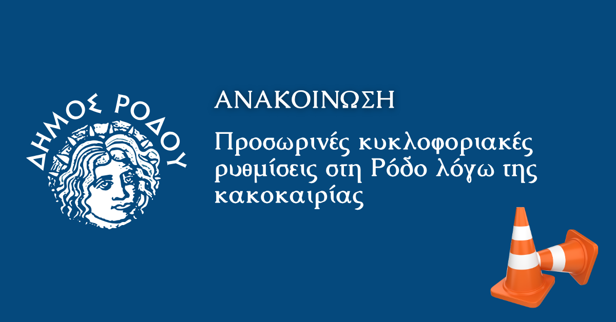 Λόγω της επιδείνωσης των καιρικών συνθηκών και με γνώμονα την ασφάλεια των πολιτών και την πρόληψη ατυχημάτων, από το Αυτοτελές Γραφείο Πολιτικής Προστασίας του Δήμου Ρόδου ανακοινώνεται ότι από σήμερα Τετάρτη 1 Απριλίου στις 12 το μεσημέρι τίθενται σε ισχύ οι ακόλουθες κυκλοφοριακές ρυθμίσεις:
