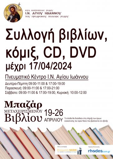 Με αφορμή την Παγκόσμια Ημέρα Βιβλίου, ο Ιερός Ναός Αγίου Ιωάννου του Προδρόμου Πόλεως Ρόδου διοργανώνει Μπαζάρ Μεταχειρισμένου Βιβλίου από τις 19 έως και τις 26 Απριλίου 2024, στο Πνευματικό Κέντρο της ενορίας.