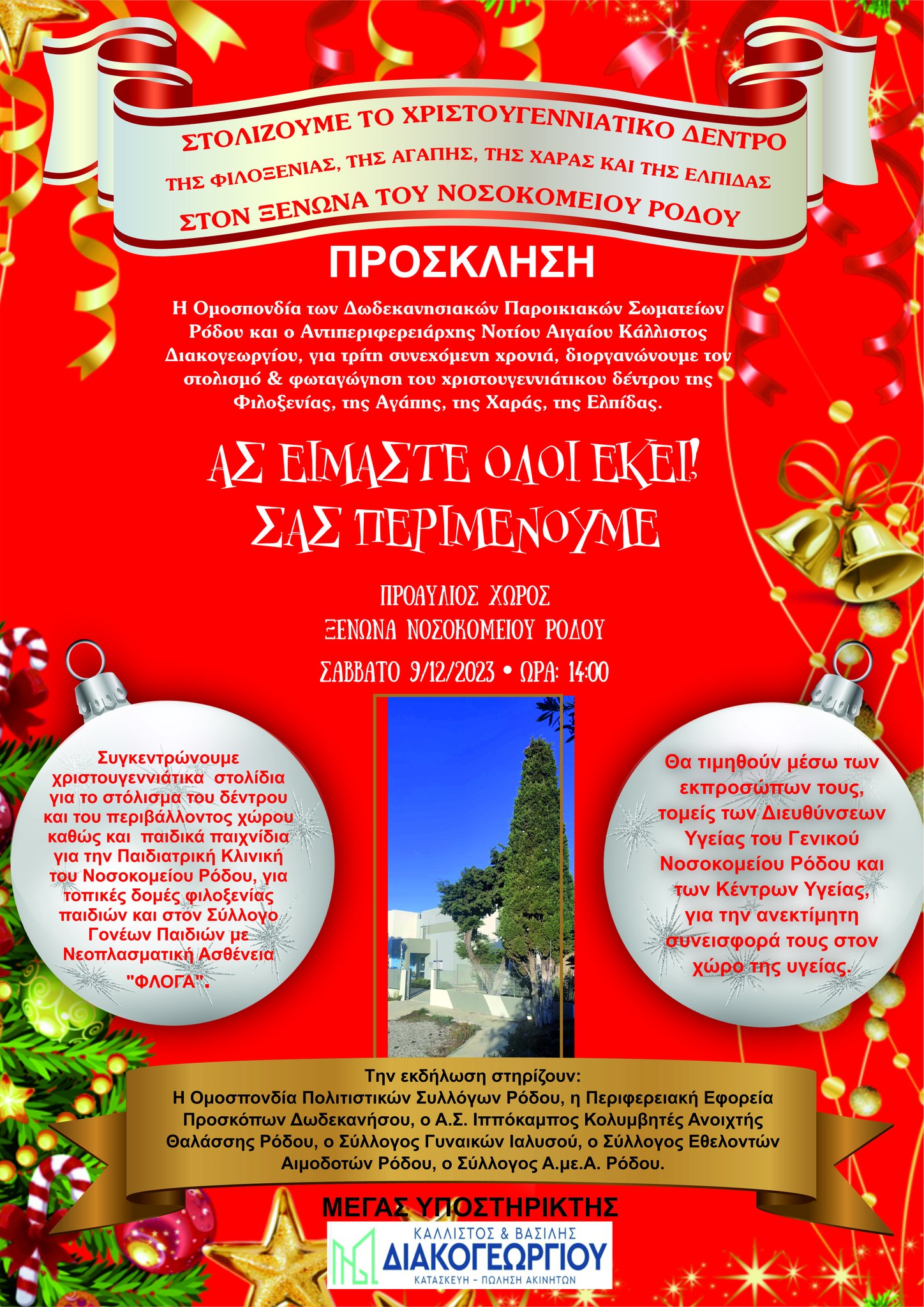 Η Ομοσπονδία των Δωδεκανησιακών Παροικιακών Σωματείων Ρόδου και ο Αντιπεριφερειάρχης Νοτίου Αιγαίου Κάλλιστος Διακογεωργίου, για τρίτη συνεχόμενη χρονιά, διοργανώνουμε τον στολισμό & φωταγώγηση του χριστουγεννιάτικου δέντρου της Φιλοξενίας, της Αγάπης, της Χαράς, της Ελπίδας στο ΞΕΝΩΝΑ του ΝΟΣΟΚΟΜΕΙΟΥ ΡΟΔΟΥ