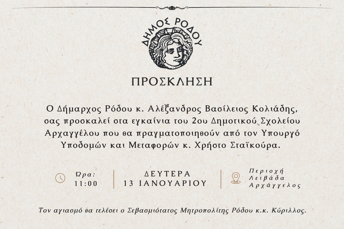Ο Δήμαρχος Ρόδου Αλέξανδρος Κολιάδης σας προσκαλεί στα εγκαίνια του 2ου Δημοτικού Σχολείου Αρχαγγέλου που θα πραγματοποιηθούν από τον Υπουργό Υποδομών και Μεταφορών Χρήστο Σταϊκούρα.