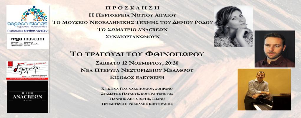 Η Περιφέρεια Νοτίου Αιγαίου, το Μουσείο Νεοελληνικής Τέχνης του Δήμου Ρόδου και το Σωματείο ANACREΩΝ συνδιοργανώνουν και σας προσκαλούν στη συναυλία λυρικού τραγουδιού με τίτλο "Το τραγούδι του Φθινοπώρου".