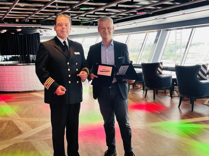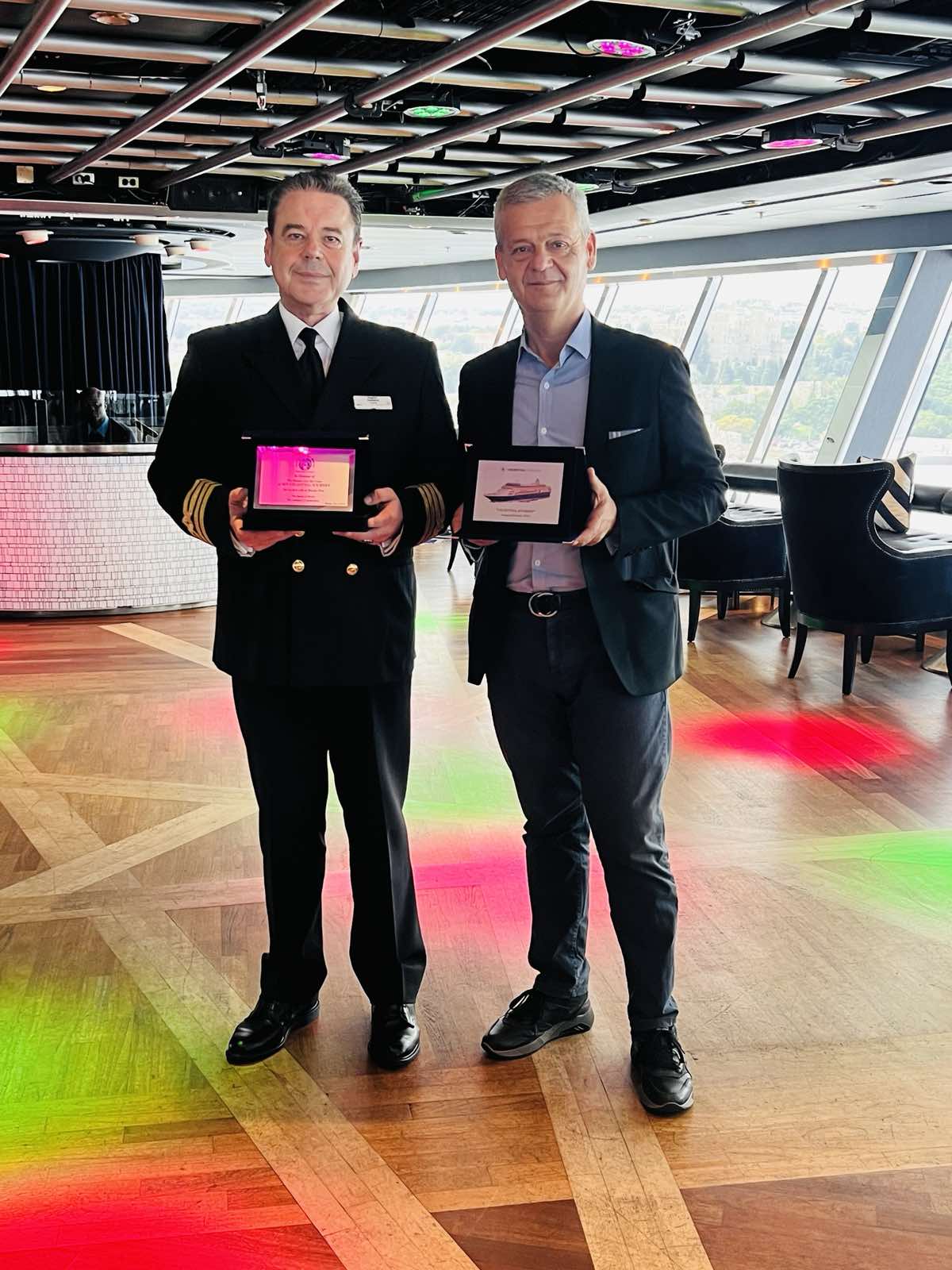 Όλοι οι παρευρισκόμενοι ξεναγήθηκαν στο κρουαζιερόπλοιο από τον καπετάνιο και το πλήρωμα και ακολούθησε η εθιμοτυπική διαδικασία ανταλλαγής πλακετών με τον αντιδήμαρχο κ. Ταρασλιά να ανταλλάσσει δώρα και πλακέτες με τον καπετάνιο του Celestyal Journey Άγγελο Βασιλάκο.