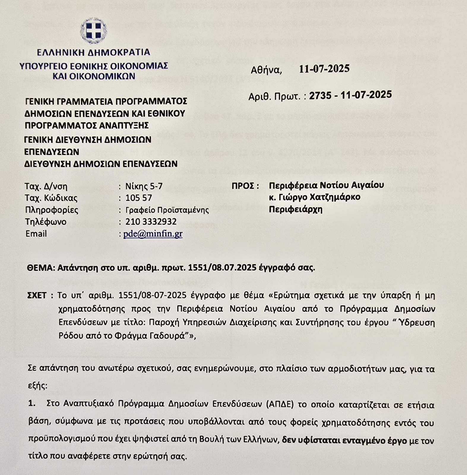 Με επίσημη απάντησή του προς την Περιφέρεια Νοτίου Αιγαίου, το Υπουργείο Εθνικής Οικονομίας και Οικονομικών, μέσω της αρμόδιας Γενικής Διεύθυνσης του Προγράμματος Δημοσίων Επενδύσεων, διευκρινίζει κατηγορηματικά ότι δεν υπάρχει ενταγμένο στο Πρόγραμμα Δημοσίων Επενδύσεων του Υπουργείου Εθνικής Οικονομίας & Οικονομικών το έργο με τίτλο «Παροχή Υπηρεσιών Διαχείρισης και Συντήρησης του έργου Ύδρευσης Ρόδου από το Φράγμα Γαδουρά».