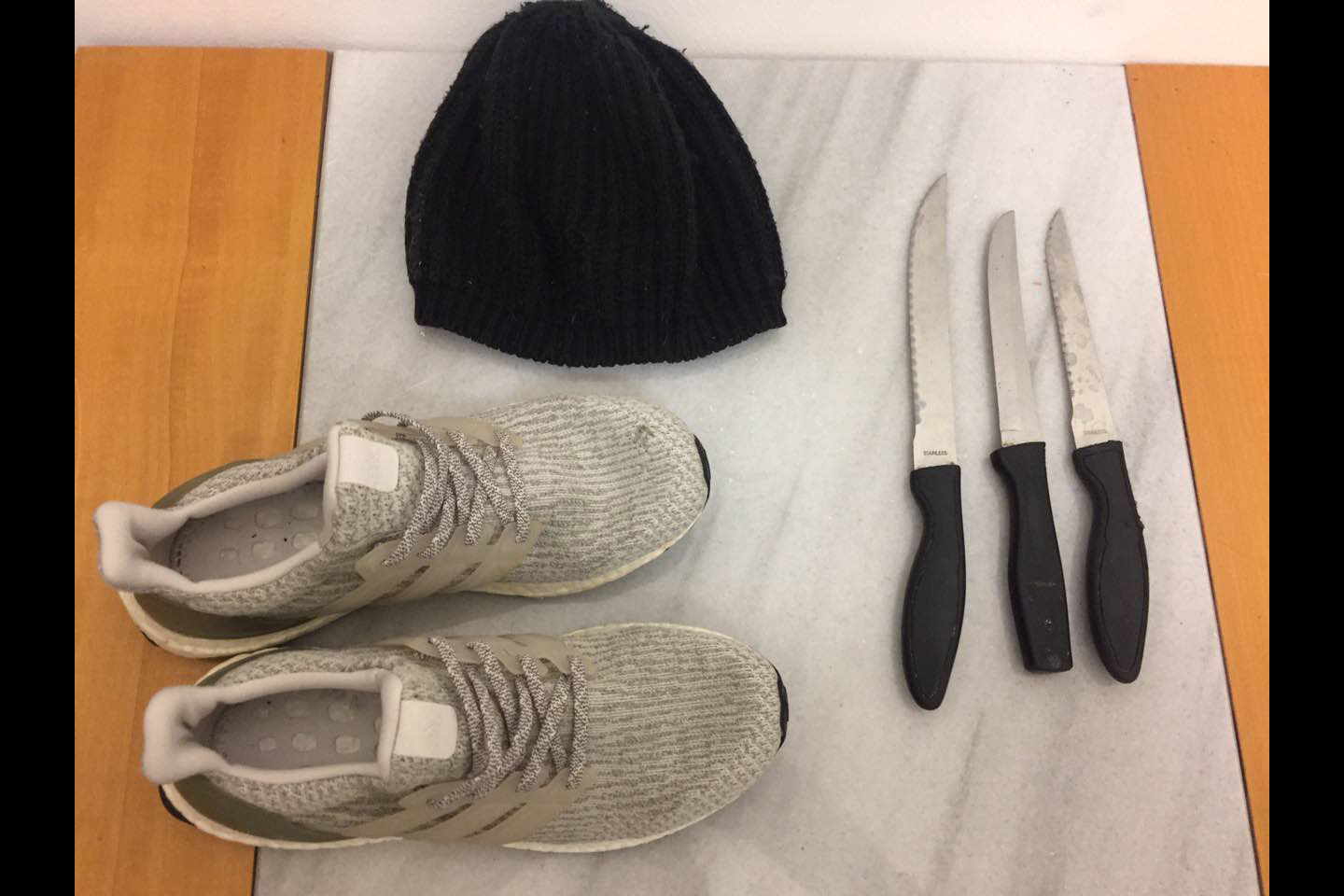 • Τρία μαχαίρια, ένα εκ των οποίων χρησιμοποιούσαν κατά τις ληστείες • Τα κλεμμένα προϊόντα καπνού