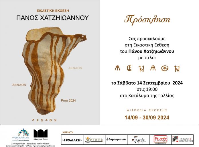 Το Κατάλυμα της Γαλλίας σε συνδιοργάνωση με την Περιφέρεια Νοτίου Αιγαίου  παρουσιάζει την εικαστική έκθεση του Πάνου Χατζηιωάννου με τίτλο «ΑΕΝΑΟΝ» .