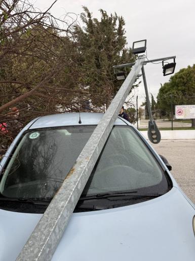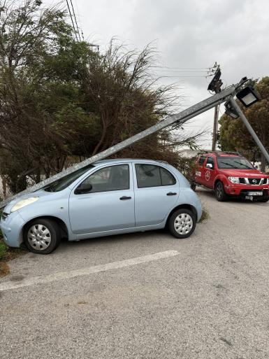 Κολώνα φωτισμού κόπηκε από τη βάση της και κατέληξε πάνω σε σταθμευμένο όχημα, ενώ ξεριζώθηκε και ένα δέντρο στη περιοχή της Αγίας Μαρίνας, κοντά στο Πολεμικό Ναυτικό. Δεν υπήρξε τραυματισμός, μόνο υλικές ζημίες.
