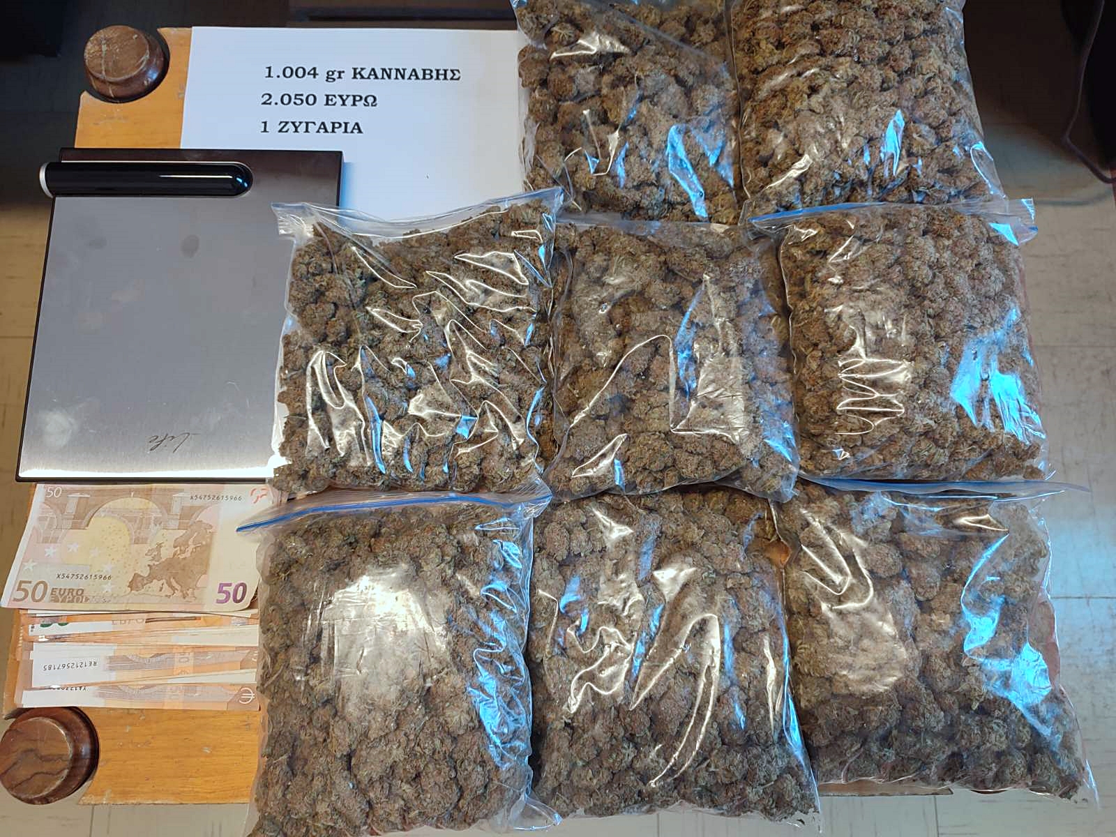 Κατασχέθηκαν -1- κιλό κάνναβη, 2.050 €, ζυγαριά ακριβείας, κ.α.