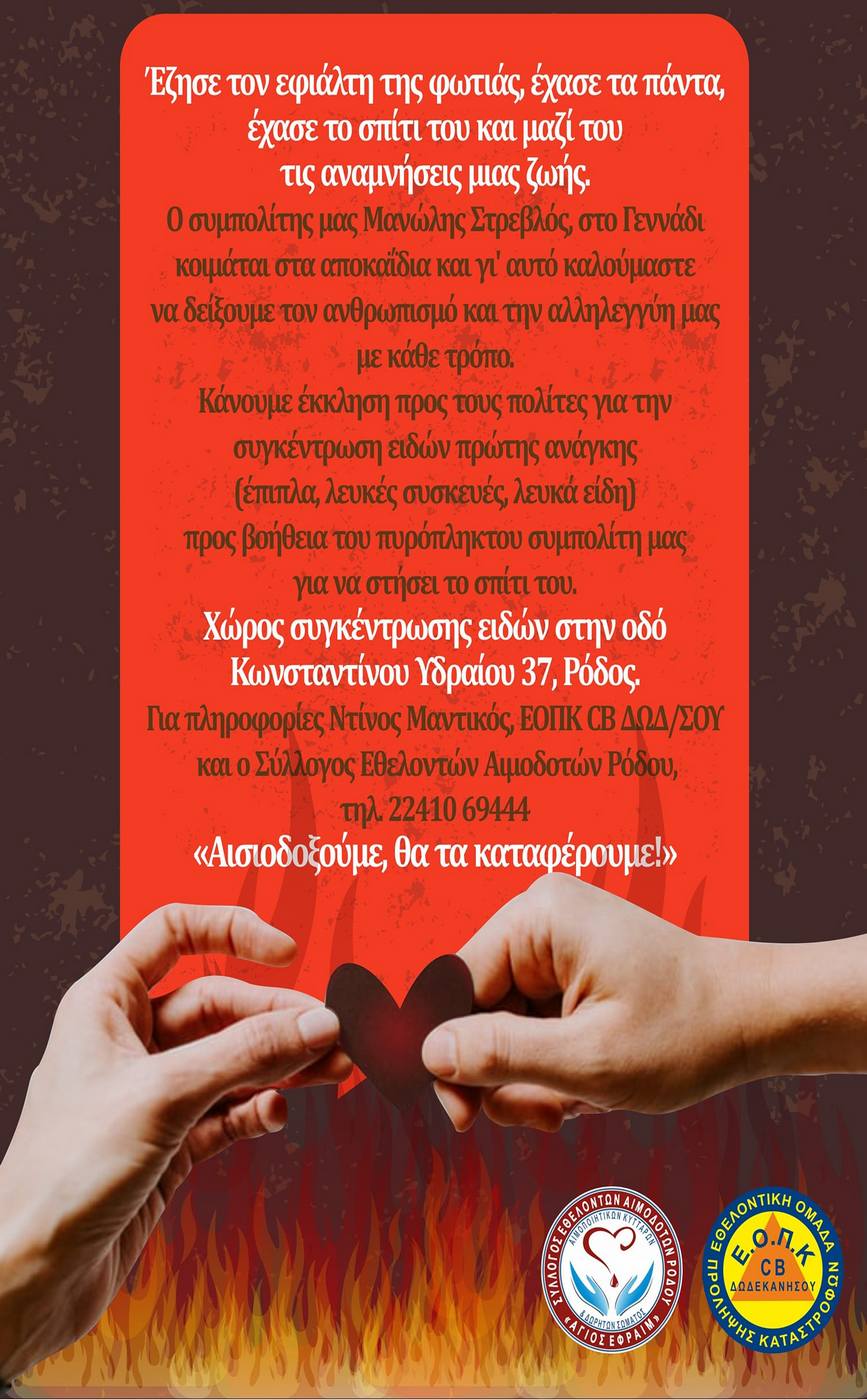 Είδη πρώτης ανάγκης, όπως έπιπλα, λευκά είδη και ηλεκτρικές συσκευές, συγκεντρώνουν η ομάδα πρόληψης φυσικών καταστροφών CBέρ και ο σύλλογος εθελοντών αιμοδοτών Ρόδου, για τον Μανώλη Στρεβλό, που έχασε το σπίτι του στην πρόσφατη πυρκαγιά και διαμένει στα κελιά του Αγίου Φιλήμονα στην Αρνίθα.