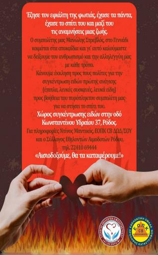 «Ο Μανώλης Στρεβλος είναι χειριστής φορτωτή του Δήμου στη Νότια Ρόδο και έχει δώσει το αίμα του όλα αυτά τα χρόνια στις πυρκαγιές του νησιού μας μπαίνοντας κυριολεκτικά μέσα στην φωτιά με το μηχάνημα για να σώσει το νησί μας. Είναι το ελάχιστο που μπορούμε να κάνουμε γι αυτόν τον άνθρωπο», αναφέρουν χαρακτηριστικά οι δύο οργανώσεις στην ανακοίνωση τους. Τα είδη συγκεντρώνονται στην οδό Κων/νου Υδραίου 37 στην πόλη της Ρόδου.